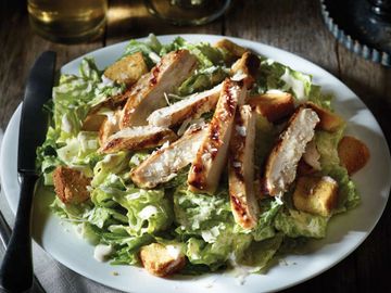 ( Crip Romaine lettuce tossed w. our Caesar dressing & topped w. sliced char grill chicken, tomatoes, black olives, parmesan cheese & Croutons)